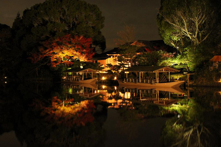 本堂および大沢池周辺の広大なエリアを、幻想的で柔らかな光で照らし出します。